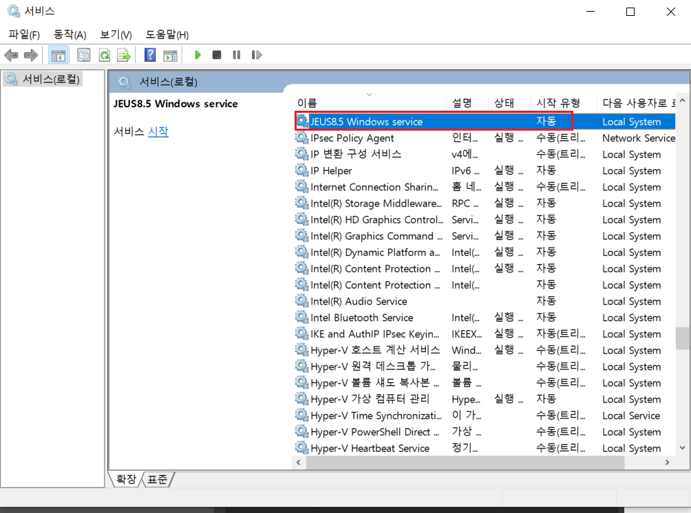 그 중 JEUS8.5를 선택 후 서비스 [시작] 버튼을 누른다.