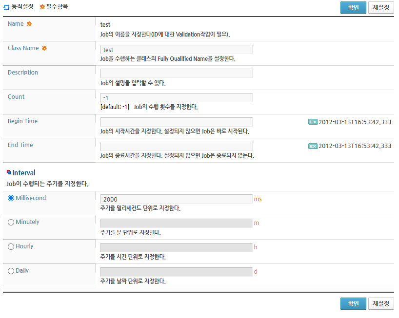 Job 설정화면에서 Job의 이름과 Job을 수행할 클래스 이름, Job이 수행될 주기를 입력하고 [확인] 버튼을 클릭한다.