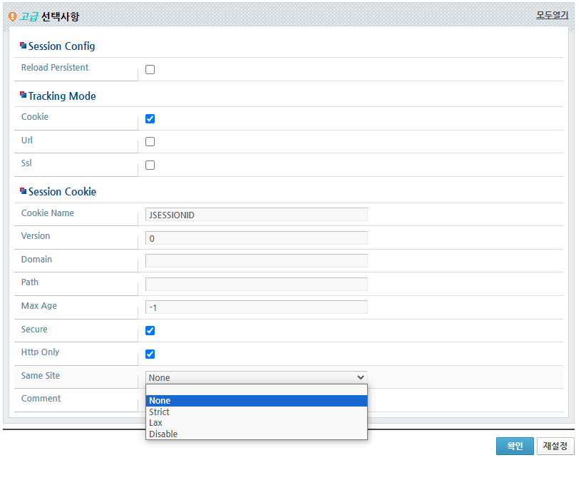Servers > 서버선택 > Engine > Web Engine > Session Config > 고급 선택사항 > SameSite 설정