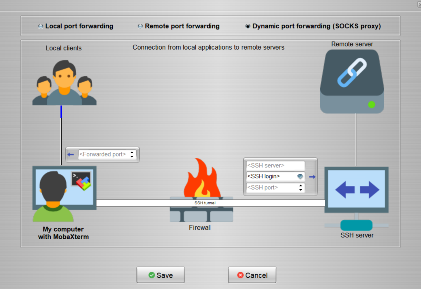RPF를 사용하면 원격 SSH 서버에서 다른 서버로 연결할 수 있다. - Dynamic Port Forwarding (DPF) : DPF를 사용하면 ssh client의 로컬에 SOCKS 프록시 서버로 전환한다.